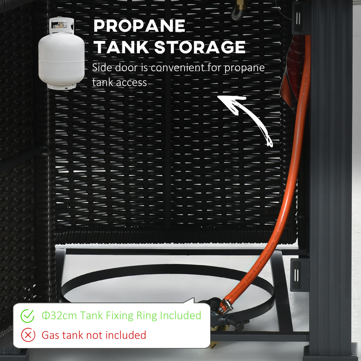 Duo design, with rain cover: Both a gas fire pit and outdoor dining table - does double the job in one compact size. Lid to cover the firepit when needed as table. Propane tank is required - not included. Protective sheet to shield table against weather damage.50,000 BTU burner, with smokeless fire pit: Clean burn, helps to retain the warmth longer. Electronic ignition system to start, with flame adjustment knob.Safe: Fire pit table features a thermo thermometer (thermocouple) - senses when the flame goes out/drop in temperature and closes the valve. Glass wind guard to keep flying sparks encased.Rattan body: A garden-beautiful gas fire pit table, effortlessly matches with your other furniture.Dimensions: 80L x 80W x 61Hcm. Regulator and hose included. Assembly required.