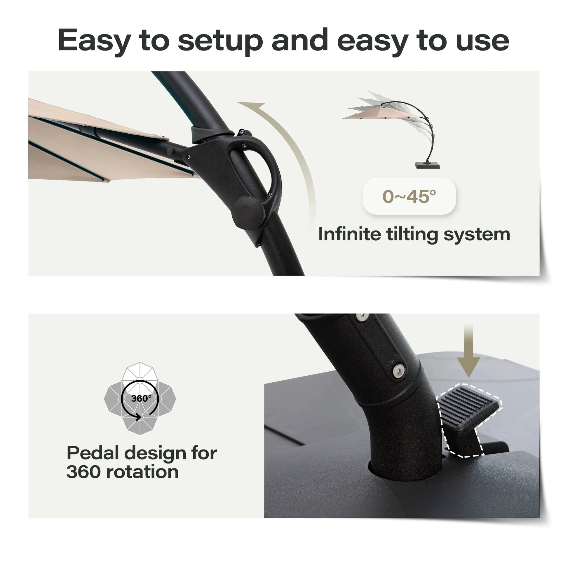 • This patio umbrella comes with a unique pedal design that allows for 360° rotation. By twisting the user-friendly crank handle, you can easily adjust the umbrella to find the perfect shade at any time of the day.