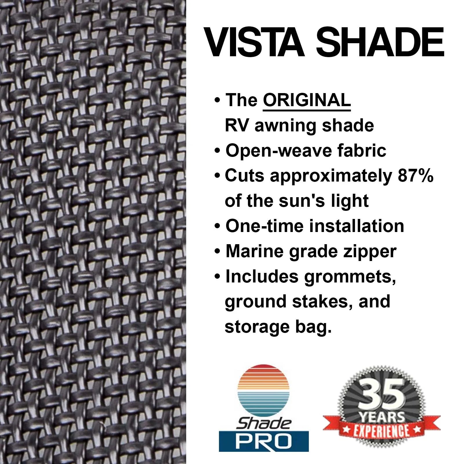 • The Vista Shade for Power Awnings is the only RV awning shade made specifically for 12V RV awnings. It is simply the easiest shade to set up on the market today. It's perfect for awnings that provide little shade because they roll out flat. The open-weave fabric cuts approximately 85% of light for a cool and comfortable shade. It provides some privacy without blocking your view and doubles as a wind breaker, too.The Vista Shade for Electric Awnings comes in two pieces: a 6 ft. body and an insert.Example: If you order a Vista Shade with a 10 ft. drop, that means the body will be 6 ft. and the insert will be 4 ft. This allows for you to reach the zipper without needing a ladder. The insert is slid into the awning roller and rolls up with the awning. When you want to set up the Vista Shade, simply zip the body into the insert. Patent Pending